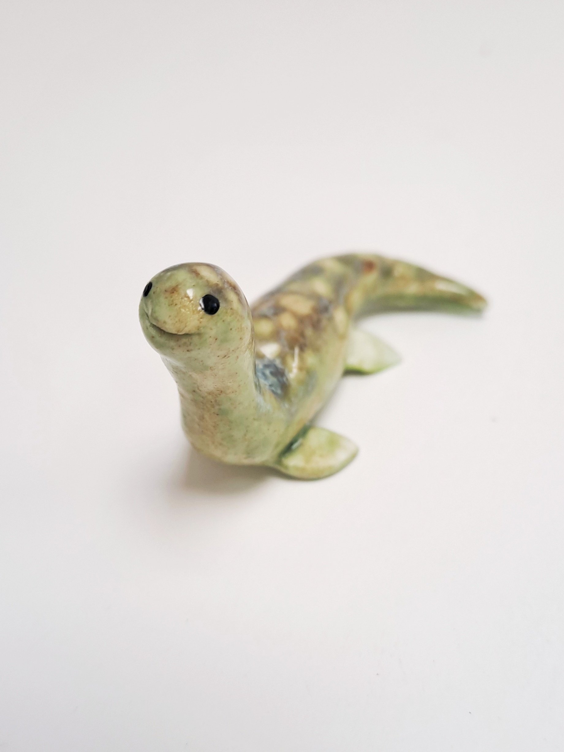 This little bubba is made from porcelain clay and has a mottled green glaze.